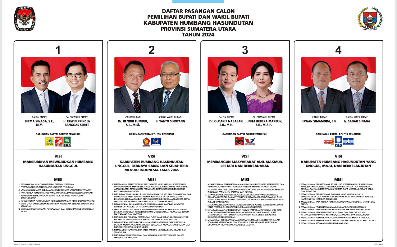 KPU Kabupaten Humbang Hasundutan mengumumkan Daftar Pasangan Calon (DPC) Bupati dan Wakil Bupati Humbang Hasundutan Tahun 2024 selengkapnya dapat diunduh pada tautan berikut : https://kab-humbanghasundutan.kpu.go.id/public/kab-humbanghasundutan/koleksigambar/1728019043Screenshot 2024-10-04 121203.png....