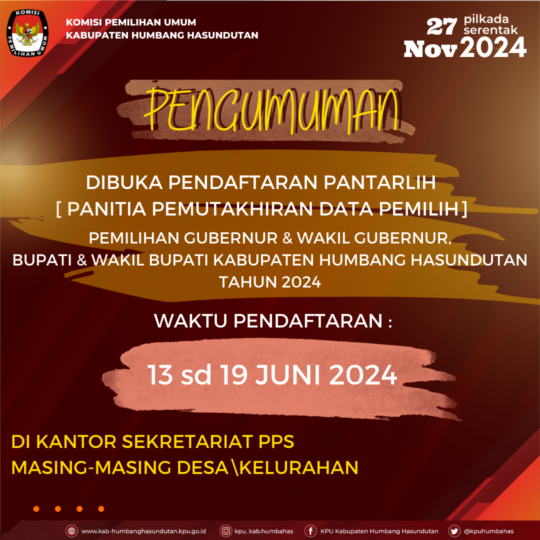 Informasi tentang Pendaftaran Pantarlih,selengkapnya dapat diunduh pada tautan berikut:https://kab-humbanghasundutan.kpu.go.id/public/kab-humbanghasundutan/dmdocument/1718248577PENDAFTARAN.pdf