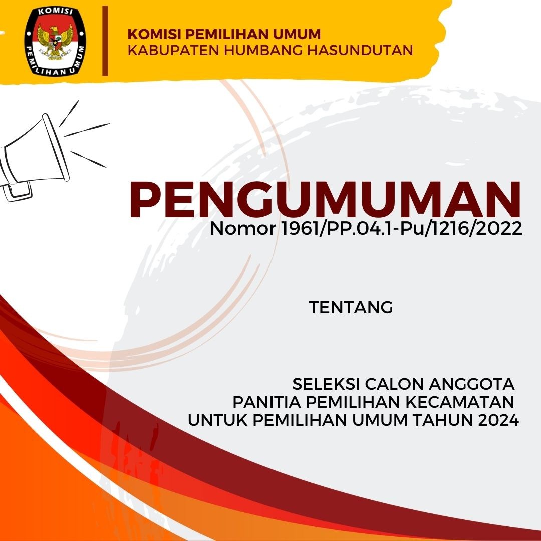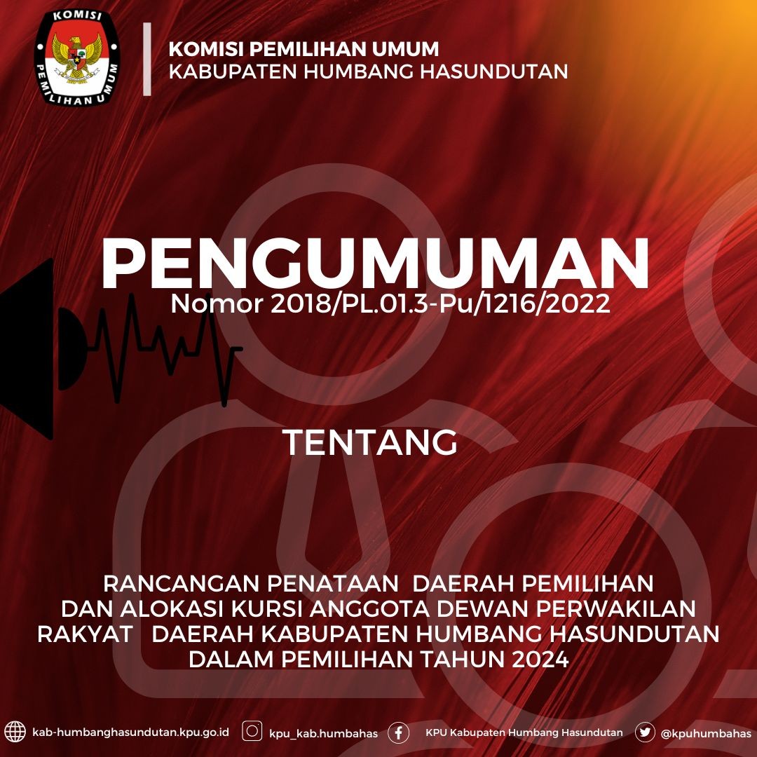 Berikut ini kami sampaikan Pengumuman Komisi Pemilihan Umum Kabupaten Humbang Hasundutan Nomor 2018/PL.01.3-Pu/1216/2022 Tentang Rancangan Penataan Daerah Pemilihan dan Alokasi Kursi Anggota DPRD Kabupaten Humbang Hasundutan Dalam Pemilihan Tahun 2024.
