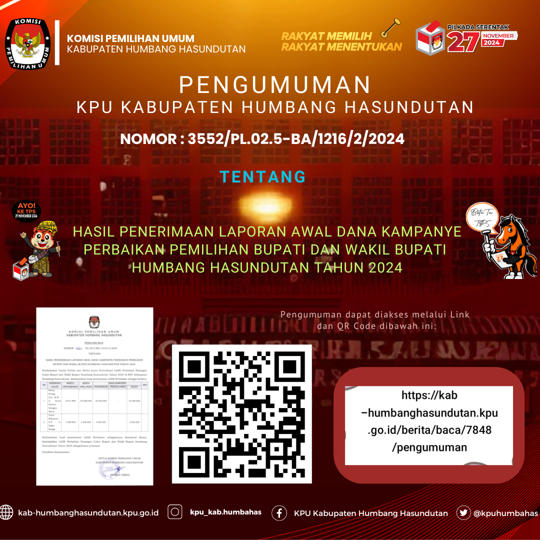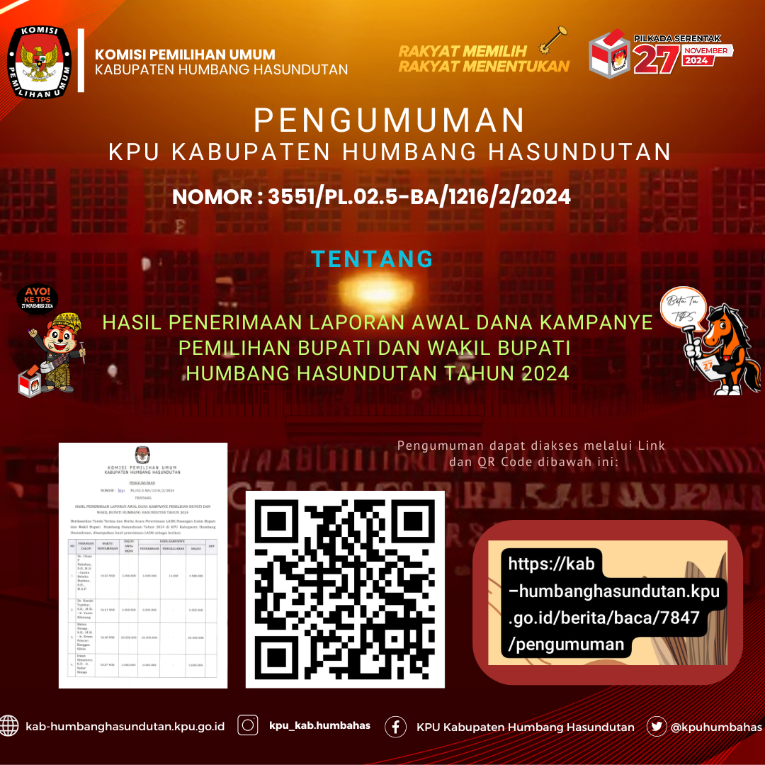 KPU Kabupaten Humbang Hasundutan mengumumkan Daftar Pasangan Calon (DPC) Bupati dan Wakil Bupati Humbang Hasundutan Tahun 2024 selengkapnya dapat diunduh pada tautan berikut : https://kab-humbanghasundutan.kpu.go.id/public/kab-humbanghasundutan/koleksigambar/1728019043Screenshot 2024-10-04 121203.png