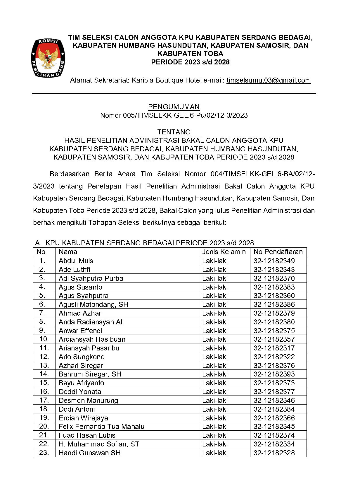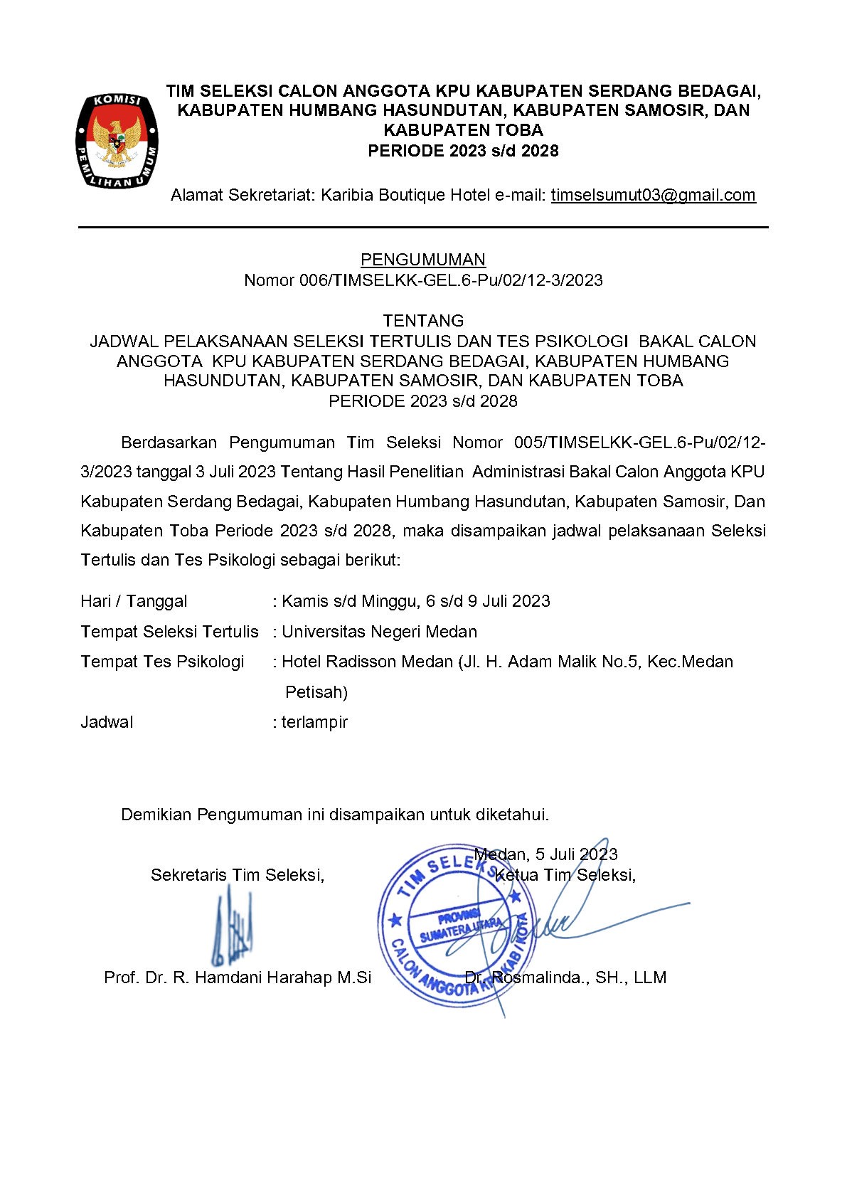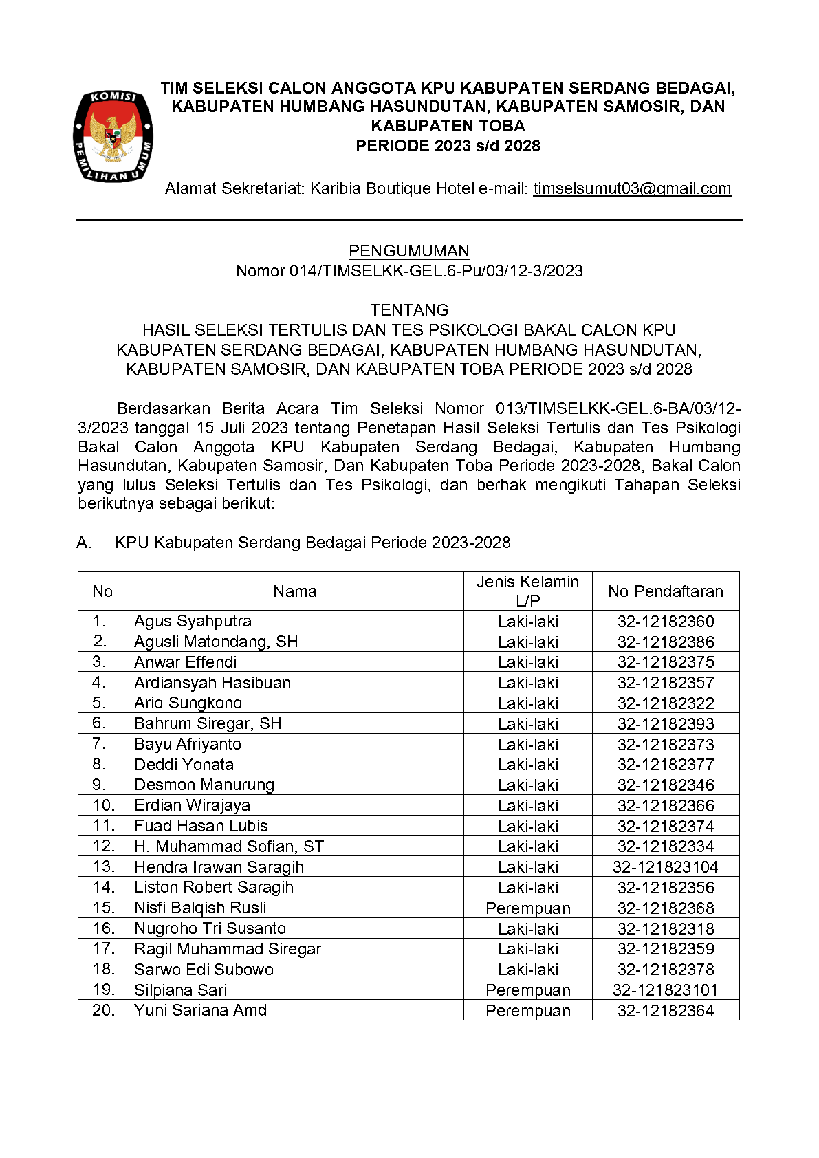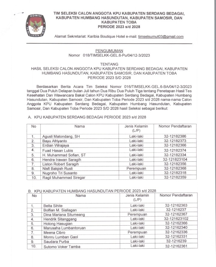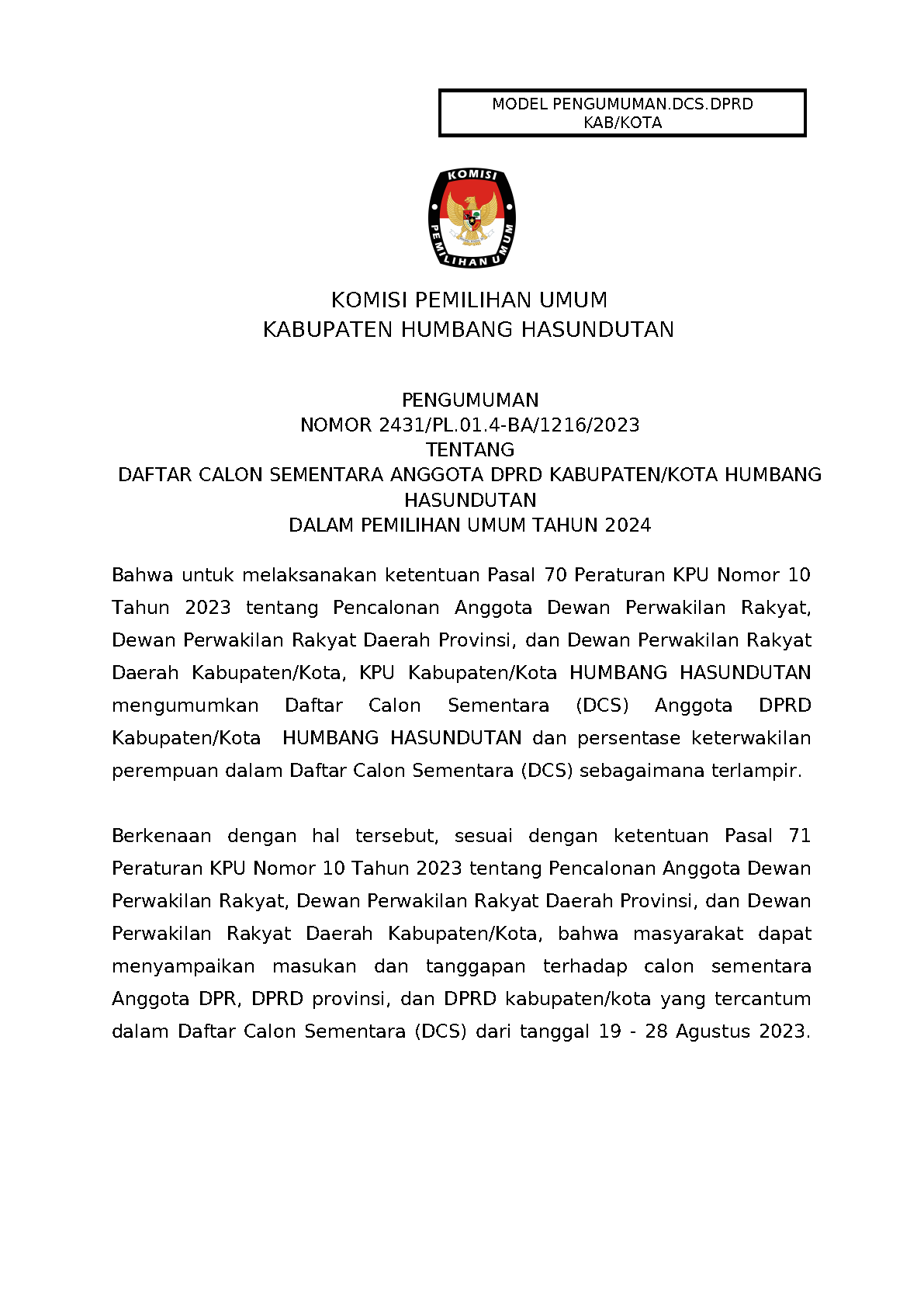 Teman Pemilih Berikut kami sampaikan Pengumuman KPU Kabupaten Humbang Hasundutan Nomor 2431/PL.01.4-BA/1216/2023 Tentang Daftar Calon Sementara Anggota DPRD Kabupaten Humbang Hasundutan dalam Pemilihan Umum Tahun 2024. Masyarakat dapat menyampaikan Masukan dan tanggapan terhadap Calon Sementara Anggota DPR, DPRD Provinsi dan DPRD Kabupaten/Kota yang tercantum dalam Daftar Calon Sementara (DCS) dari Tanggal 19 - 28 Agustus 2023. Untuk mendapatkan masukan dan tanggapan masyarakat memperhatikan hal-hal berikut : 1. Masyarakat dan tanggapan masyarakat disampaikan secara tertulis terkait dengan pemenuhan persyaratan administrasi bakal calon Anggota DPR, DPRD Provinsi dan DPRD Kabupaten/Kota 2. Masukan dan tanggapan masyarakat disertai dengan bukti identitas diri dan bukti yang relevan kepada KPU Kabupaten Humbang Hasundutan melalui : website info Pemilu KPU yaitu https://infopemilu.kpu.go.id kantor KPU Kabupaten Humbang Hasundutan di Jalan Demokrasi No. 1 Desa Aeknauli II Kec. Pollung email : kpuhh.subbagtekhnis@gmail.com 3. Informasi lebih lanjut dapat menghubungi helpdesk Pencalonan KPU Kabupaten Humbang Hasundutan. Pengumuman Lengkap dapat diunduh pada Tautan Berikut Pengumuman Nomor 2431 Tentang DCS DPRD Kab. Humbang Hasundutan